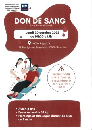 En tant qu’étudiante du FIM CCI Formation Campus 2 et alternante au sein de l’Établissement Français du Sang à Saint-Lô, j’ai souhaité, avec mes camarades, m’engager pour cette cause en organisant une collecte de sang au sein du Pôle Agglo 21.